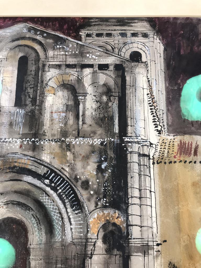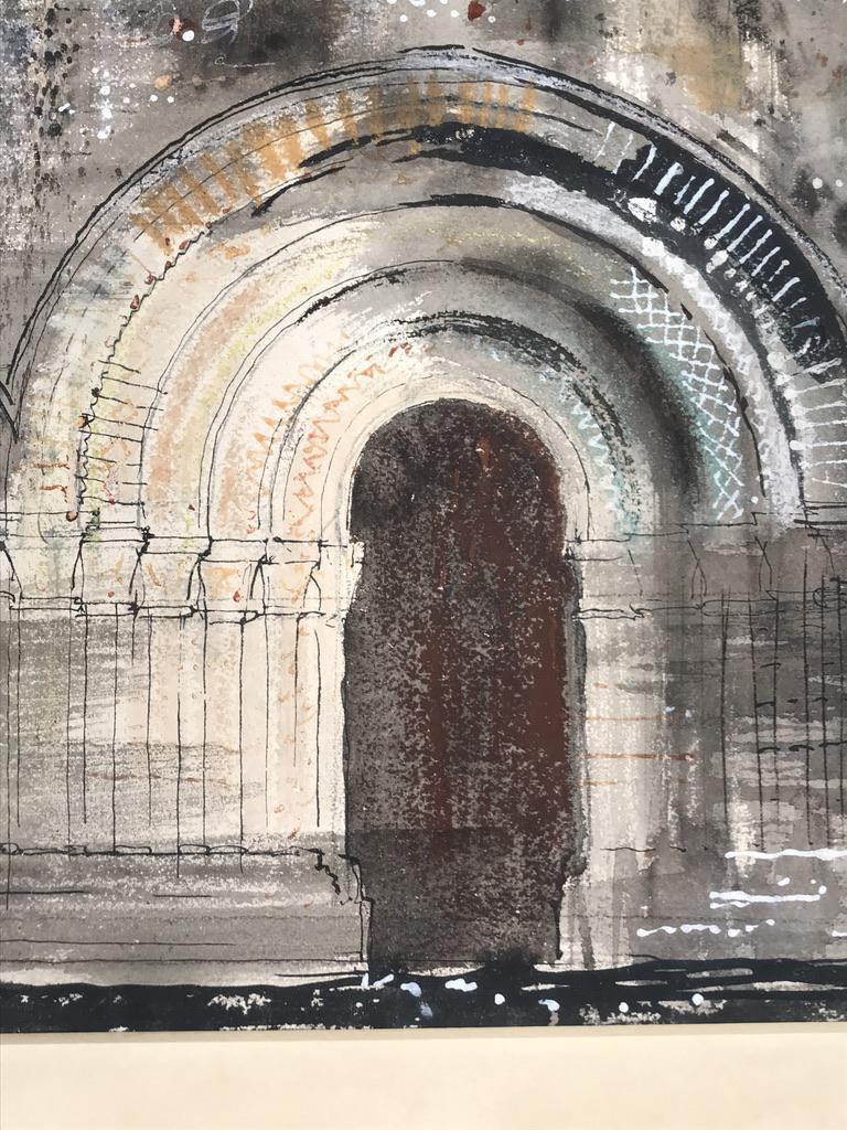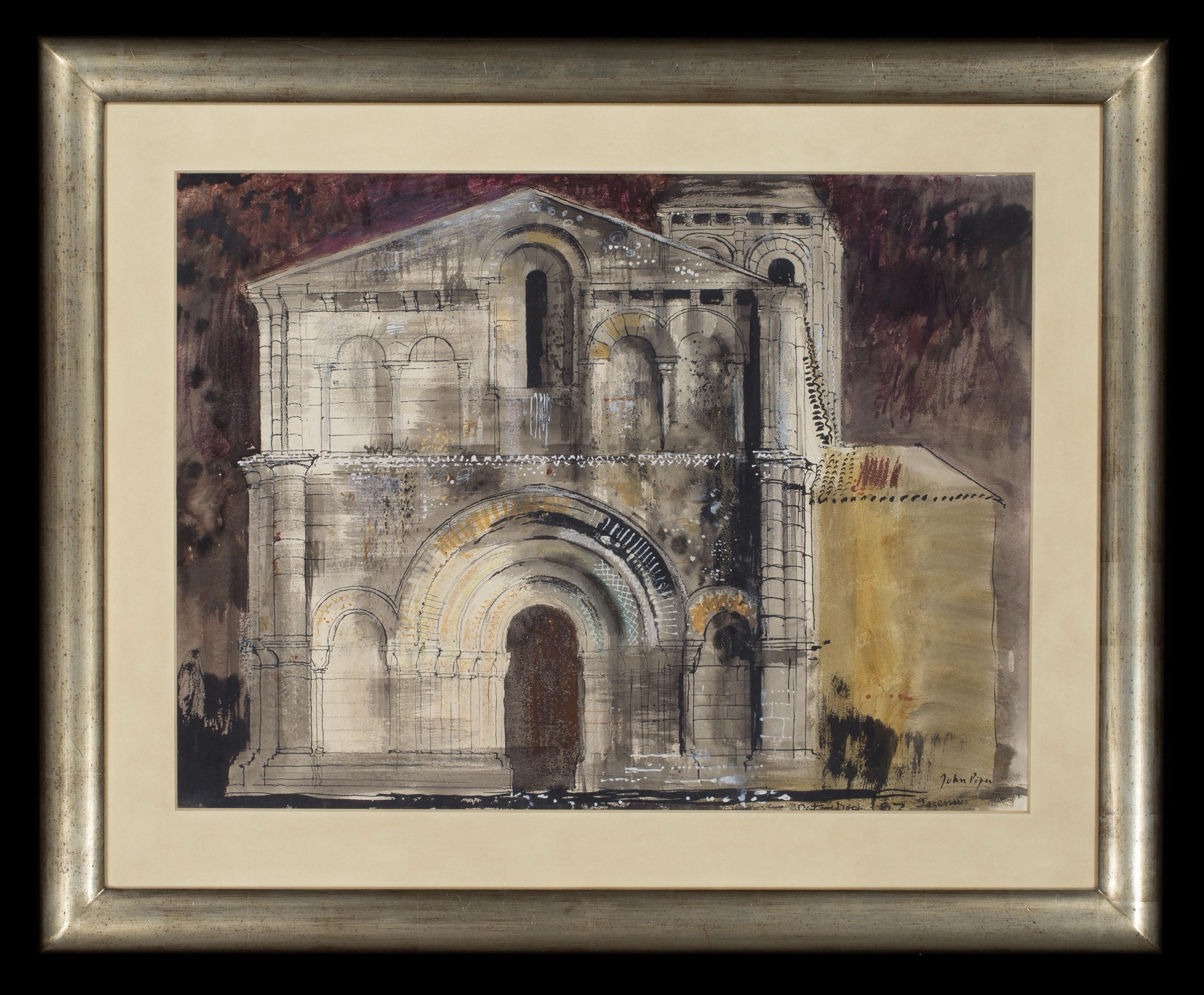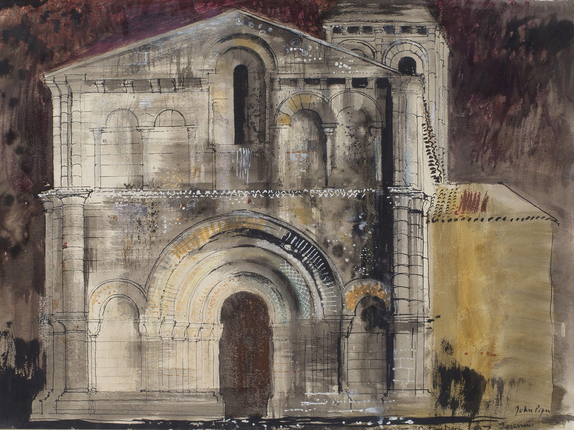 From the mid 1950s, Piper travelled frequently in France and took numerous trips to Charente, Toulouse, Moissac and the Dordogne. Depitcting the striking façade of the Romanesque church at Jazennes in the Charente-Maritime region of southwest France.