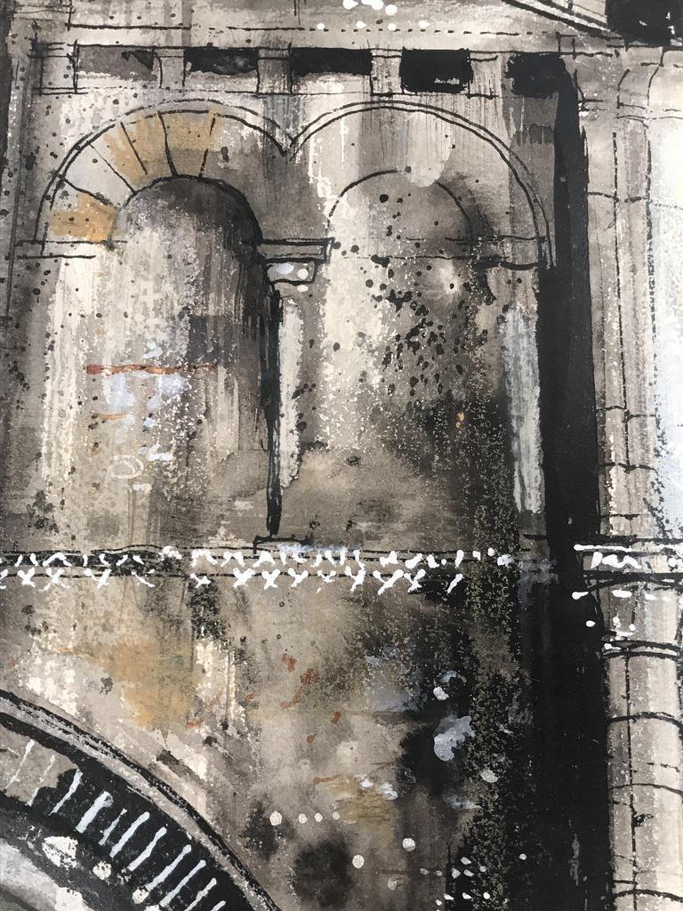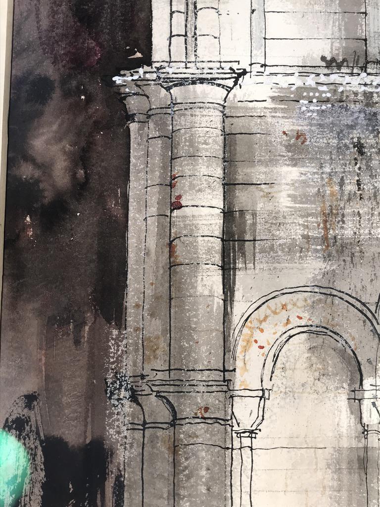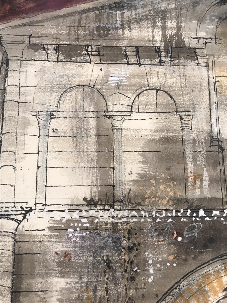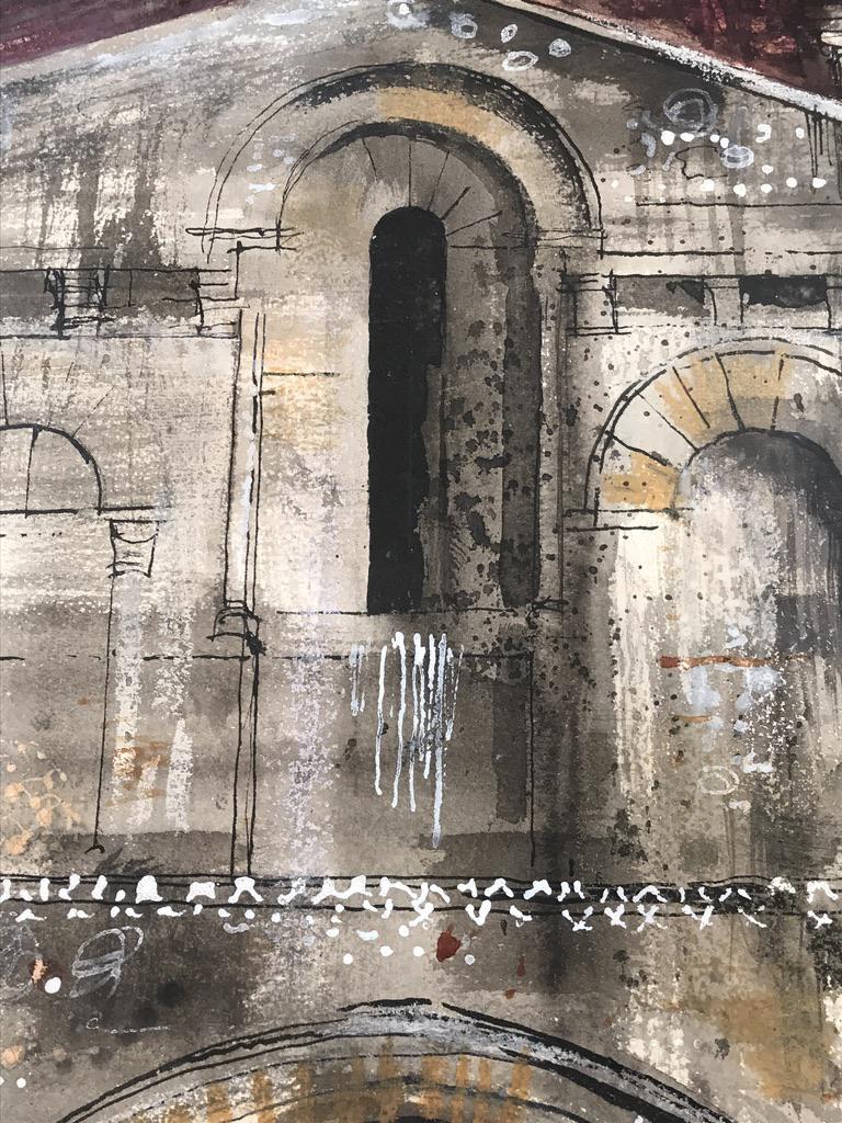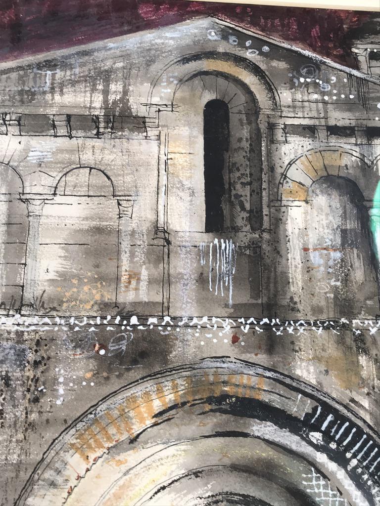 From the mid 1950s, Piper travelled frequently in France and took numerous trips to Charente, Toulouse, Moissac and the Dordogne. Depitcting the striking façade of the Romanesque church at Jazennes in the Charente-Maritime region of southwest France.