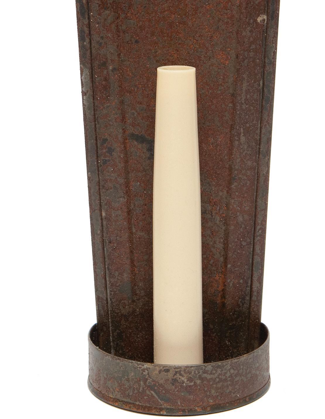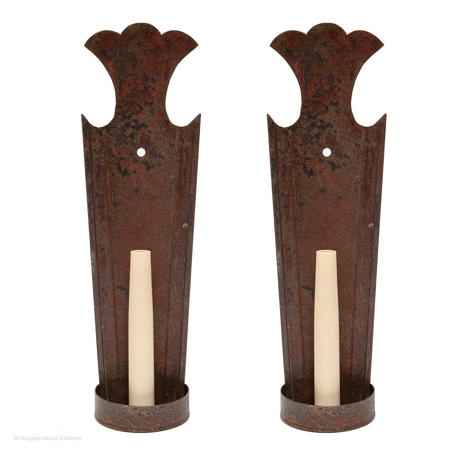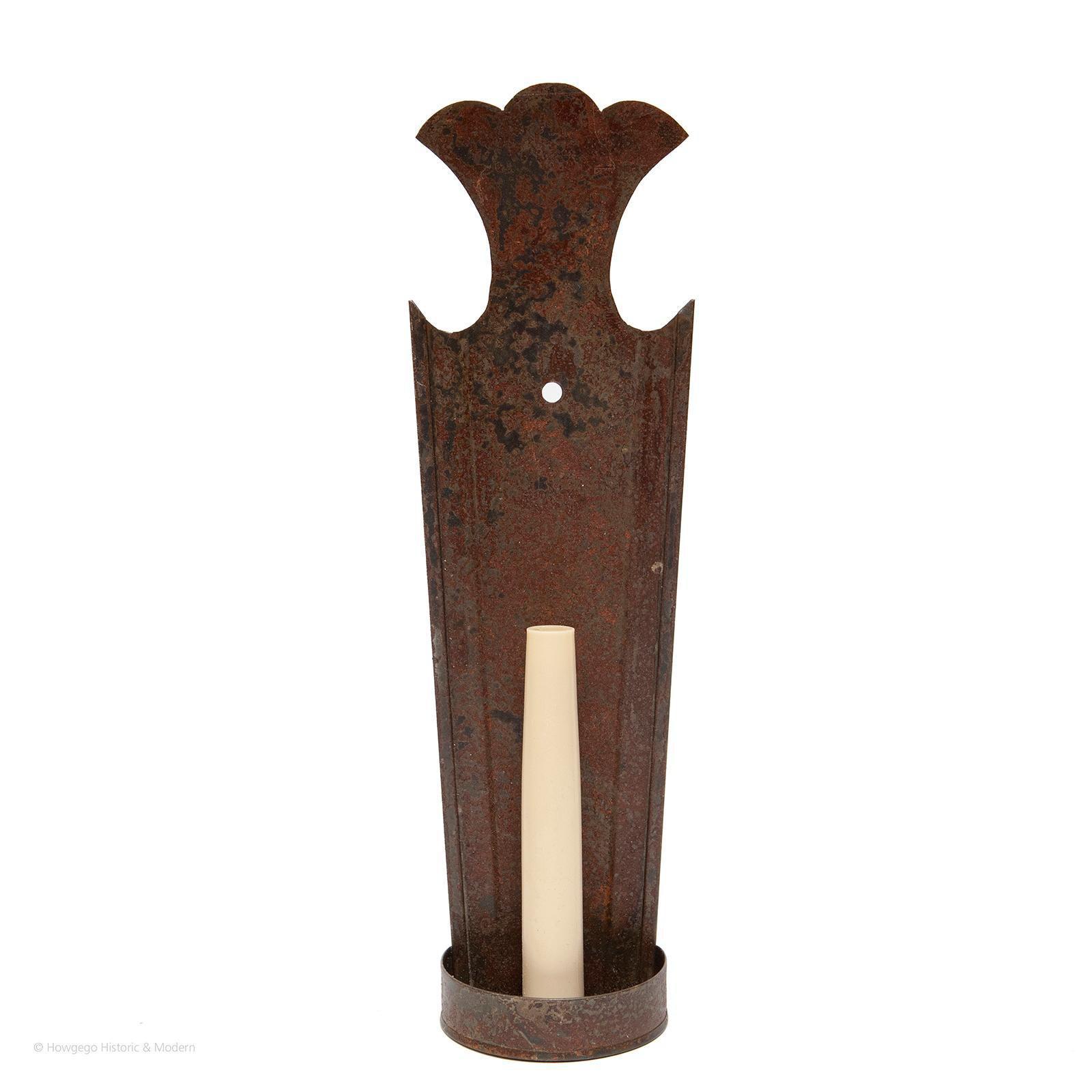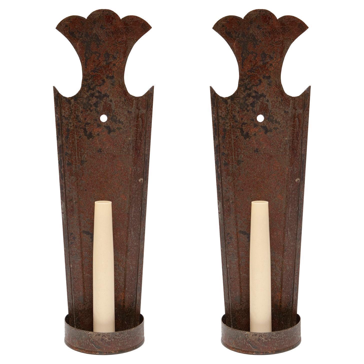 Tapering single candle, tin wall sconce with shaped cresting and antiqued patina. Electrified with Girard Sudron candle lamps.